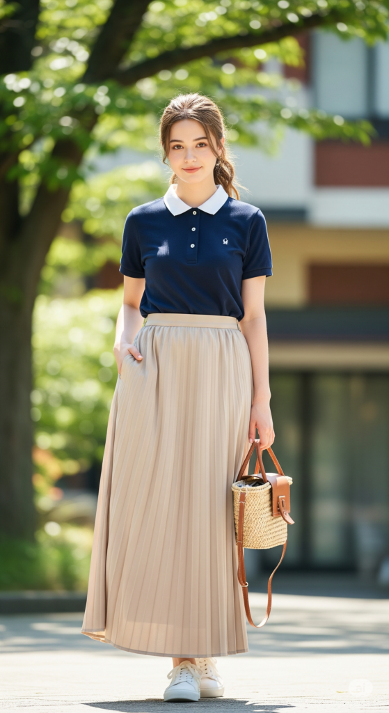Instead of the tennis mini skirt trend, go for a pleated long skirt. Style it with a polo shirt or button-down for a sporty-preppy aesthetic that’s still modest. Add chunky sneakers to keep it modern and teen-approved.