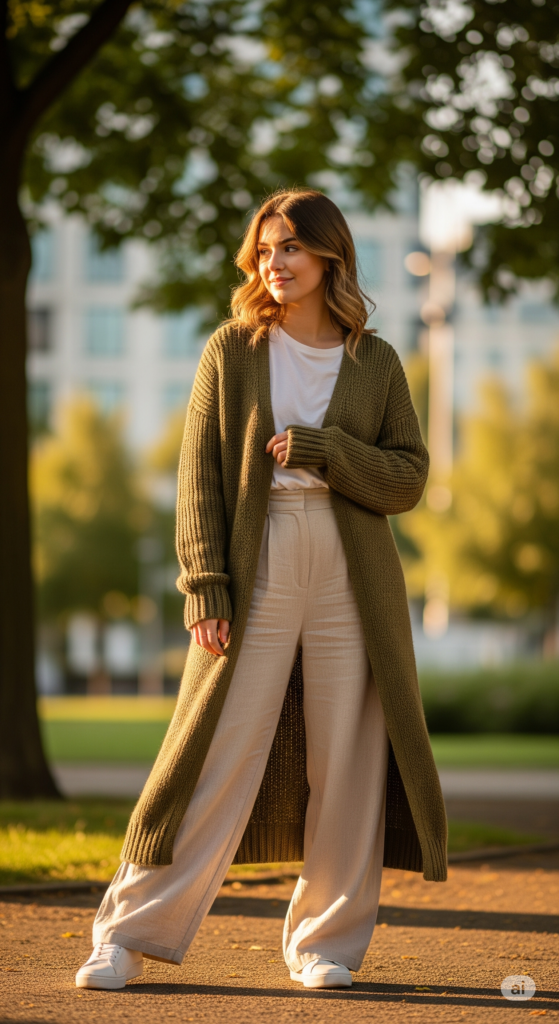 A long, flowy cardigan adds instant elegance to any outfit. Pair it with a plain t-shirt and wide-leg trousers for a modest yet fashionable classroom look. Cardigans also work great for layering in cold classrooms, and they give you endless styling flexibility.