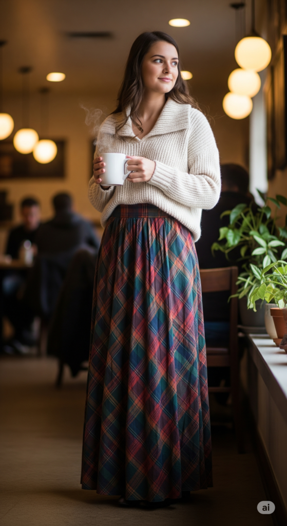 Plaid skirts are a huge trend, but instead of going short, go modest with a plaid maxi skirt. Pair it with a chunky knit sweater for a cozy preppy look. You can also add loafers or ankle boots for a polished vibe. This outfit balances Pinterest-worthy style with complete coverage.