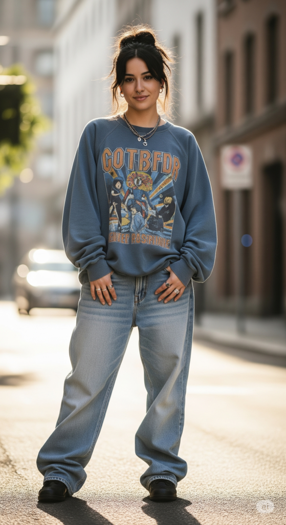 Loose, wide-leg jeans paired with an oversized sweatshirt are a back-to-school staple. This combo gives you a relaxed, street-style vibe while keeping you fully covered and comfortable. Choose neutral shades for a minimal aesthetic, or go bold with graphic sweatshirts for personality. Sneakers tie the look together perfectly.