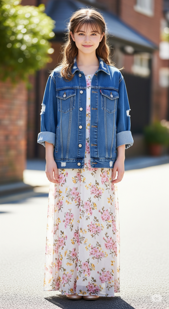 Take your favorite long dress (floral or solid) and throw on a denim jacket for instant back-to-school chic. This look transitions perfectly from summer to fall. It’s easy to style, modest, and gives you that effortless “put together” vibe without trying too hard.
