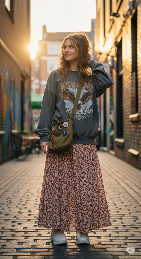 For a trendy yet modest vibe, pair a flowy maxi skirt with a baggy graphic sweatshirt. This combo is comfortable, Pinterest-worthy, and unique enough to stand out. Add high-top sneakers to complete the look.